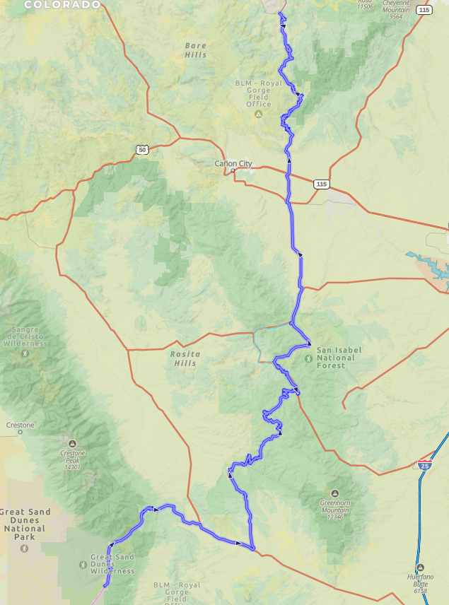 The entire route from Great Sand Dunes National park to Victor, CO is around 130 miles. Once we enter the trail in Great Sandy Dunes, it is around 100 miles before we get to a town with fuel. The city (Florence City, CO) has a single gas station, but we are only 10 miles from Canon City, CO which is much larger with many gas stations and a Walmart and can get any supplies if we need them. Most of the trail is smooth graded road or 2 track, several miles on blacktop, and only the first 20 miles or so are tougher and may affect mileage more. We didn’t haul fuel the last time we went, but everyone needs to make their own judgement call.